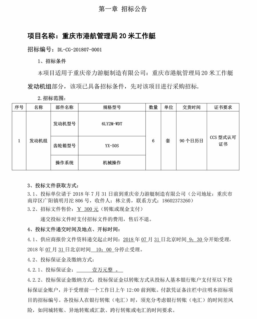 重慶市港航管理局20米工作艇發動機組招標公告
