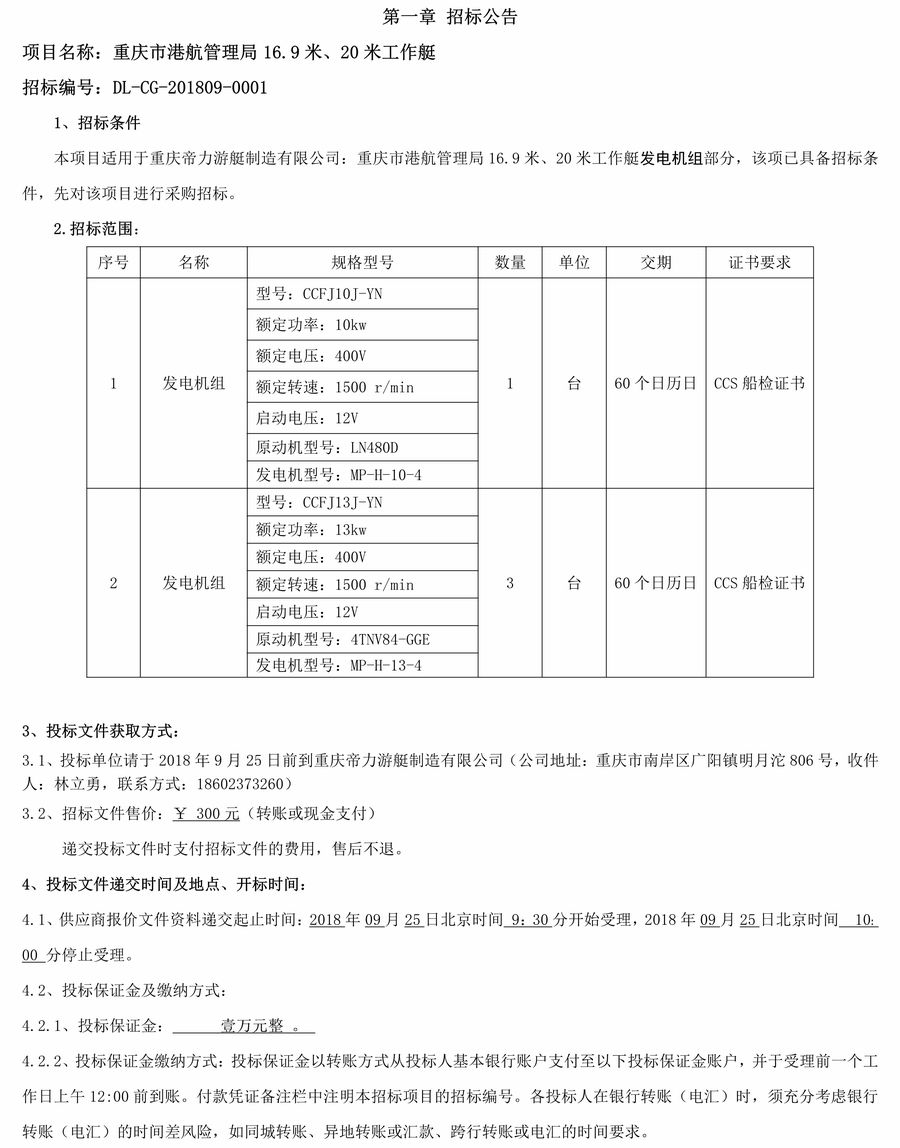 重慶市港航管理局16.9米、20米工作艇發電機組組招標公告