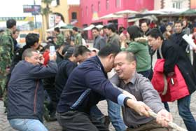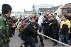 15日一大早,公司全體員工就趕到了活動現場,懷著激動的心情開始熱身。9點30分,比賽活動正式開始。一陣陣加油!聲響徹了整條街道,引來了不少游人的駐足觀看,拉開了整個年拜會活動的序幕。經過一個多小時的激烈角逐,物管公司、驕陽公司、集團公司分獲一、二、三名,公司領導親自頒獎。