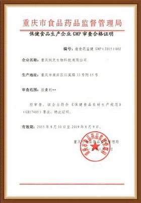 2015年8月,重慶純芝生物科技有限公司取得由重慶食品藥品監(jiān)督管理局頒發(fā)的《保健食品生產(chǎn)企業(yè)GMP審查合格證明》和《保健食品生產(chǎn)條件審查意見通知書》,順利通過了保健食品良好生產(chǎn)規(guī)范GMP(2015)002認證。同時,經(jīng)國家食品藥品監(jiān)督管理局批準,取得保健食品國食健字G20140945生產(chǎn)許可批文。